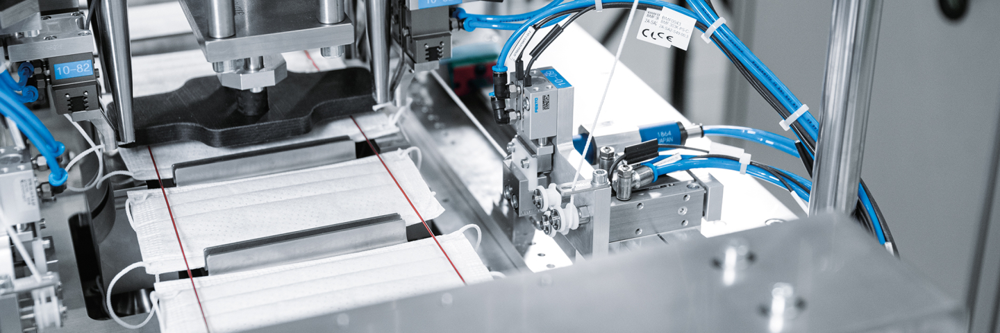 Electric and pneumatic components from Festo ensure the reliable transport of the parts or perform clamping tasks in all process steps from the three-layer unwinding station, the shaping and folding station for the non-woven fabric, the ultrasonic sealing station for sealing the edges to attaching the earloops. The servo drives CMMT from Festo for controlling the electric drives EMMT are used in the application, since they can be easily connected to PLCs from other manufacturers such as Beckhoff, Siemens and Rockwell.