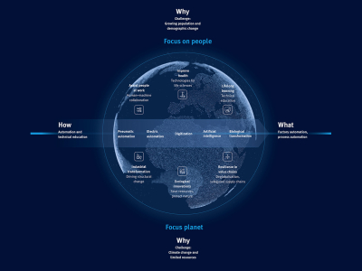 Progress in motion: How do we meet the great challenges of our time? Supplying the world's population and at the same time protecting our natural resources seem to create an irresolvable conflict. Festo sees automation technology and technical education as enabling factors that can drive the industrial transformation towards CO₂-neutral, sustainable production.
