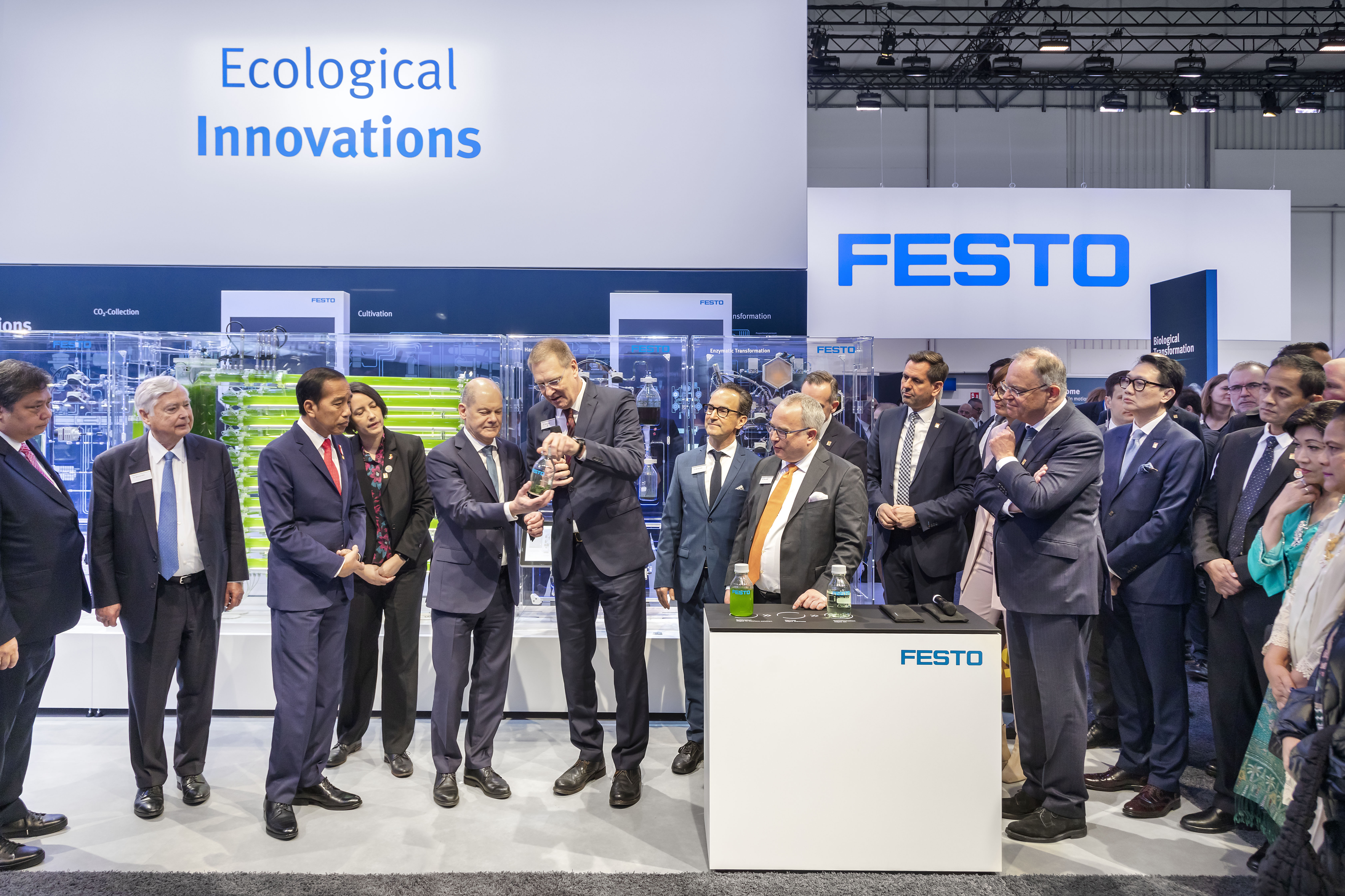 Bundeskanzler besucht Festo Stand beim Rundgang auf der Hannover Messe