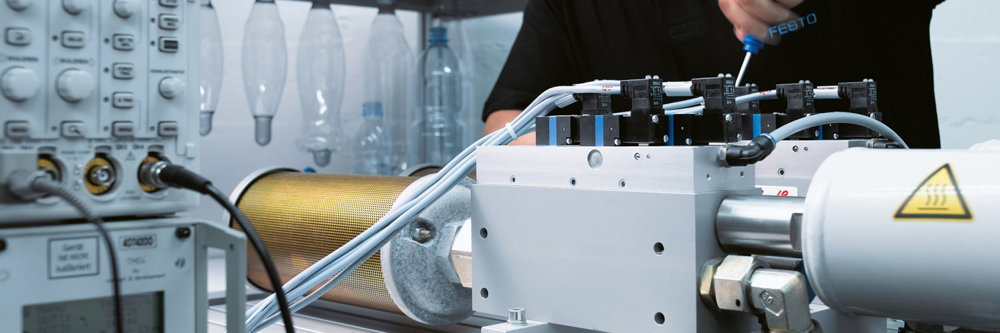 High-pressure laboratory at Festo: here, components of high-pressure pneumatics up to 40 bar are developed for the production of PET bottles in the stretch blow moulding process for linear and rotary machines.